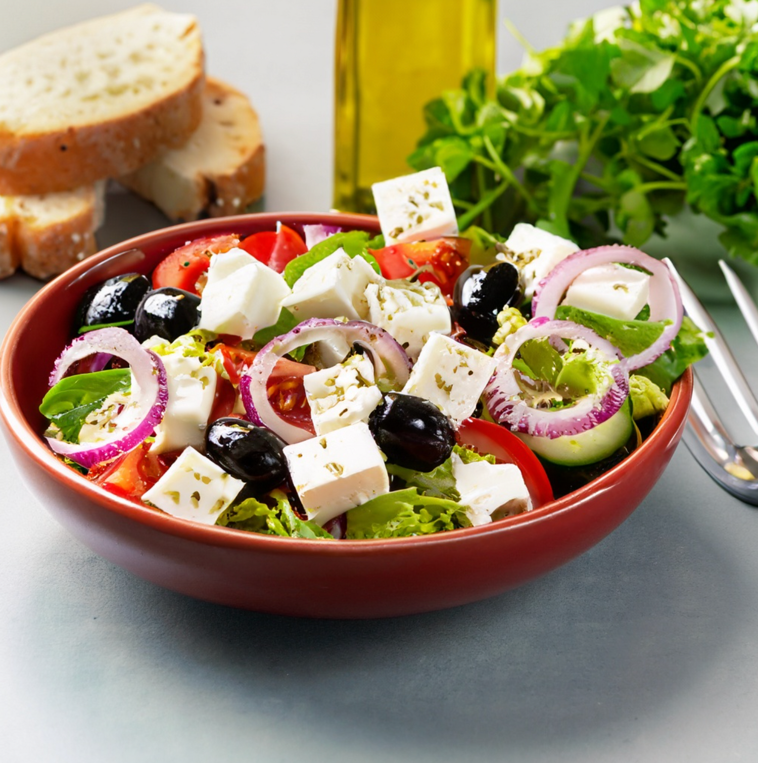 "Introducing the star of the show when it comes tasting The Best Extra Virgin Olive Oil to its fullest: the traditional Greek salad, a dish that embodies the essence of Greek culinary heritage."